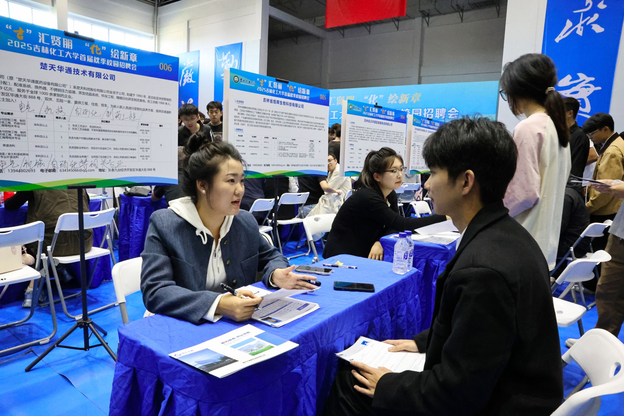 招聘会现场人头攒动、气氛热烈。参会单位中包括省内107家企业,省外22家企业。岗位需求总数达3069个,吸引了全校3548名学生到场参与,投递简历5784份,为毕业生提供了充足的择业空间。各学院党委班子成员、系主任、专任教师及毕业年级辅导员提早到场,与企业代表精准对接,充分了解行业需求、企业发展、市场趋势,并为学生现场助力,指导和推荐学生求职。毕业生们手持精心准备的简历,穿梭于各企业展位前,积极投递、自信洽谈,展现出吉化学子良好的精神风貌和扎实的专业素养。